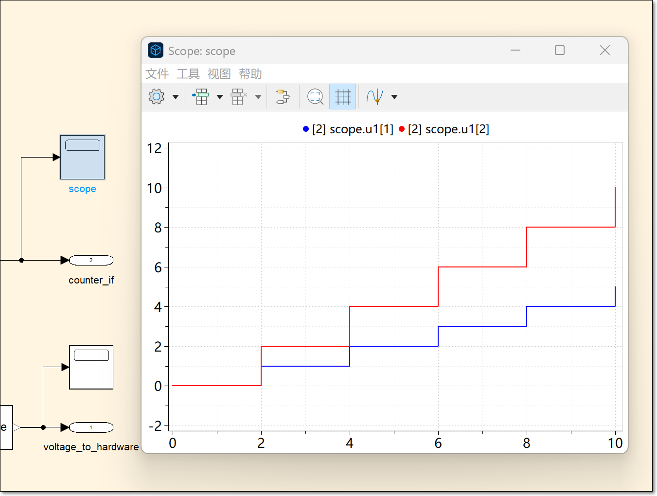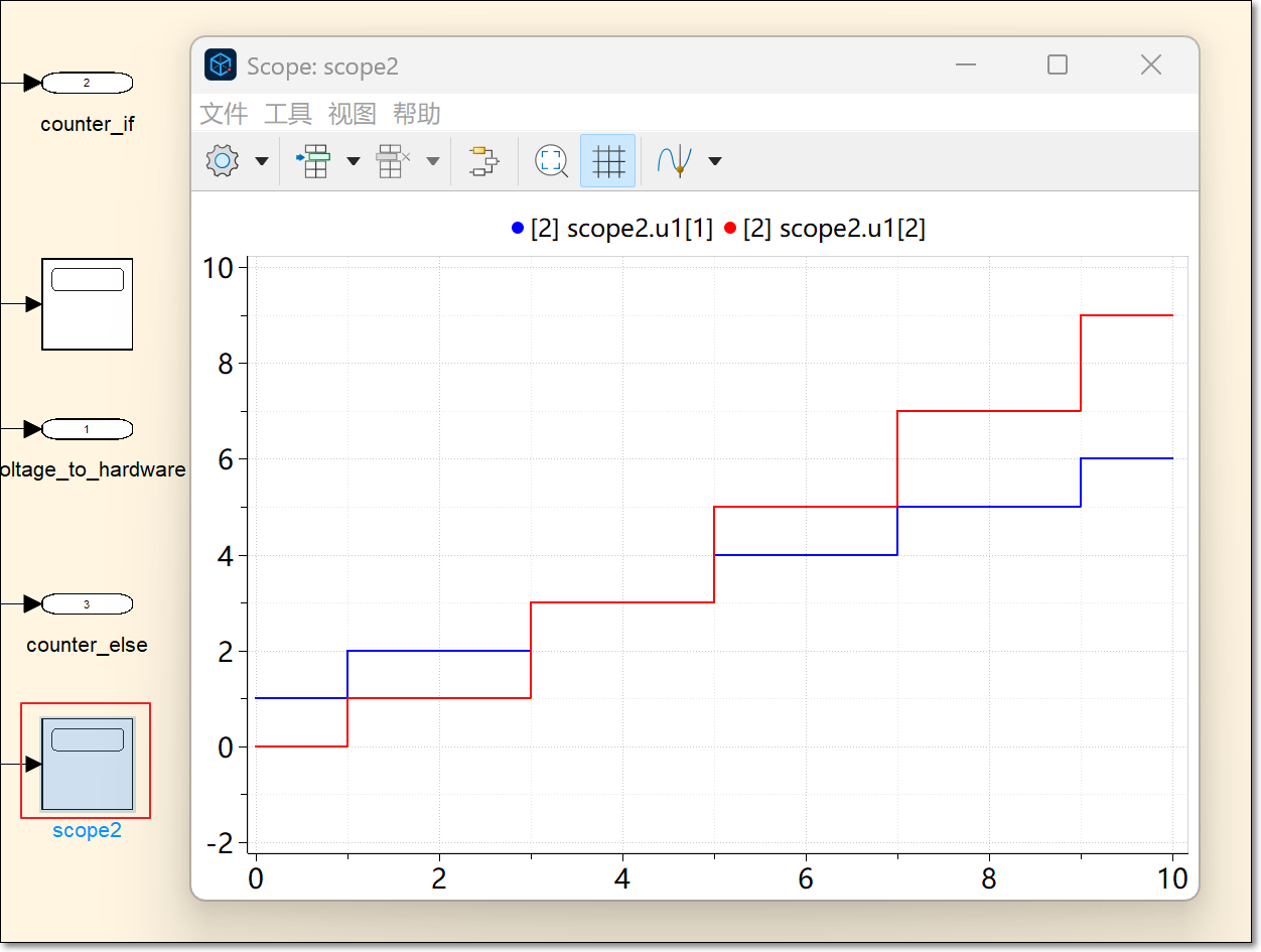 放置三个 Scope(显示仿真过程中生成的信号)模块,用来观察运行结束后的波形,它的位置在库浏览器 Sysblock.Utilities(实用工具模型库).Scope。三个 scope 模块分别连接到 IfBodysubsystem 子系统的输出端口 CounterWithTime、merge 模块的输出端口、ElseBodysubsystem 的输出端口 CounterWithTime。