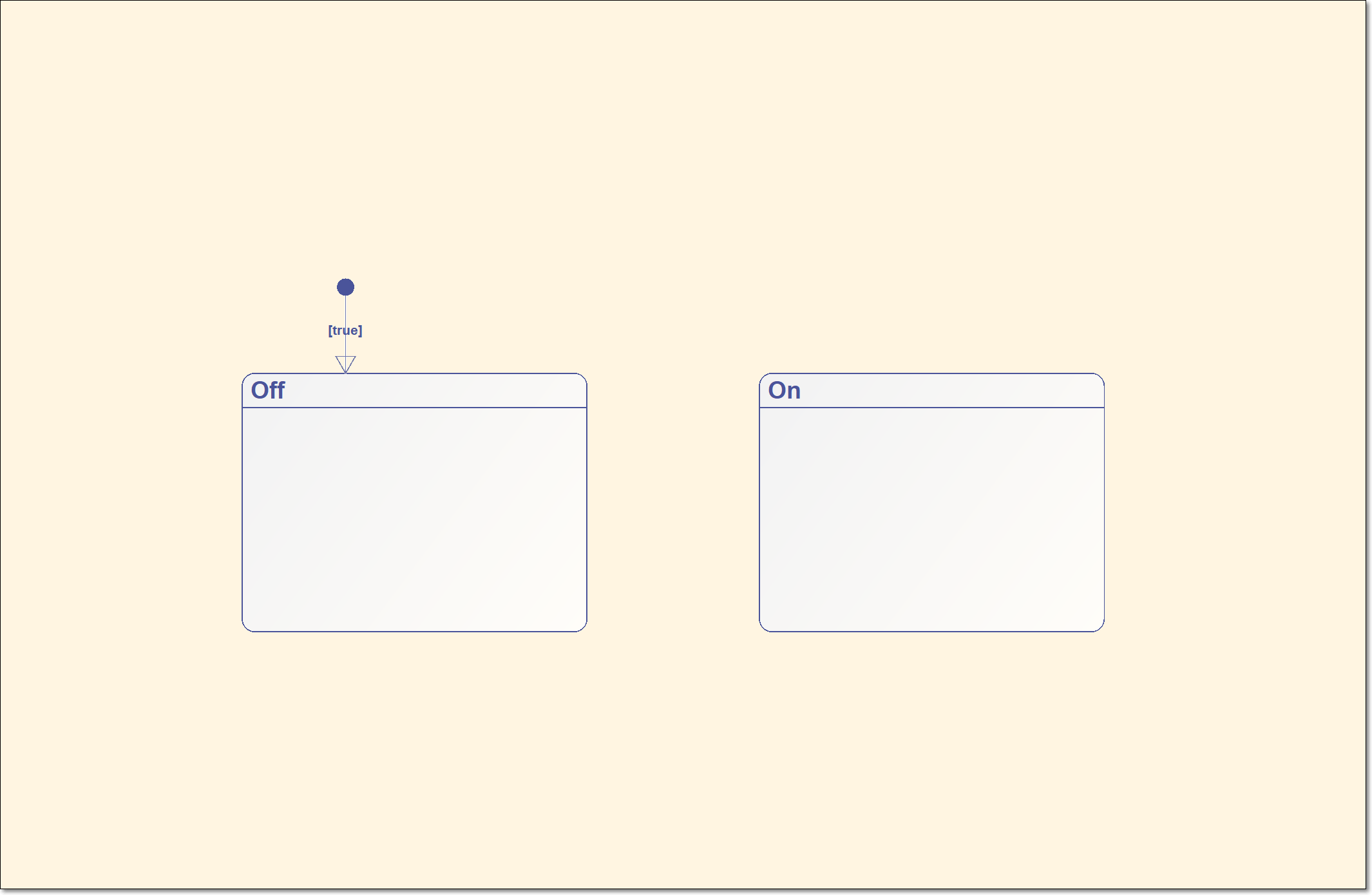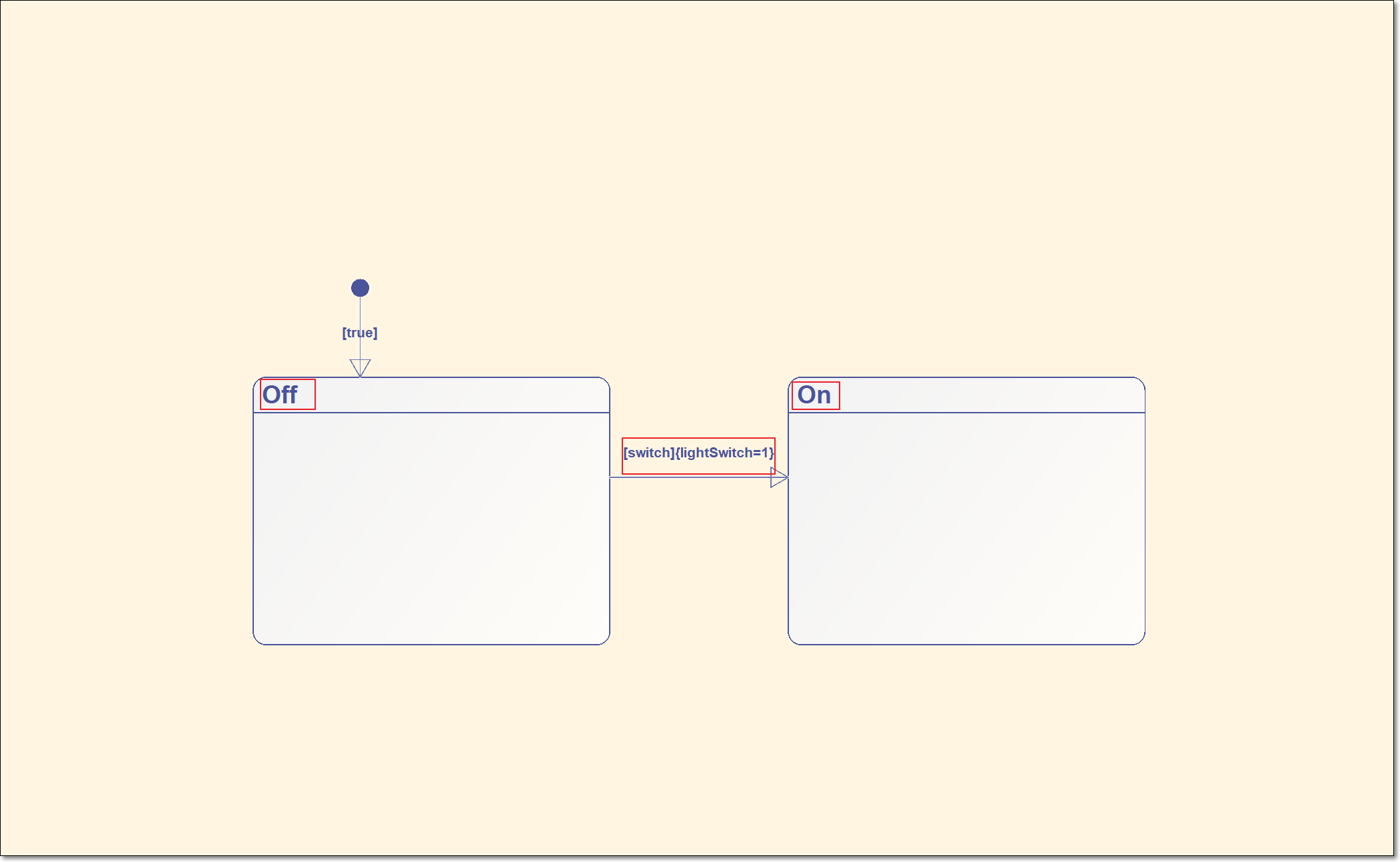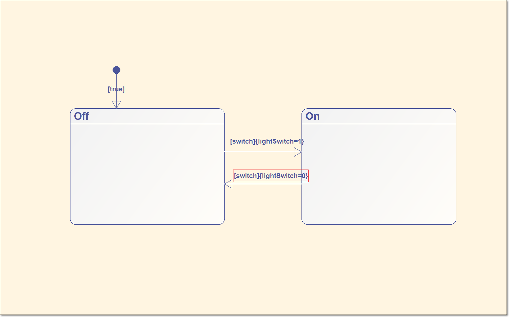 - 将鼠标放于 On 状态模块边框上,待出现红色名称时候,单击边框长按拖出信号线连接到 Off 状态模块。将信号线上 [true] 修改为 [switch]{lightSwitch=0}。