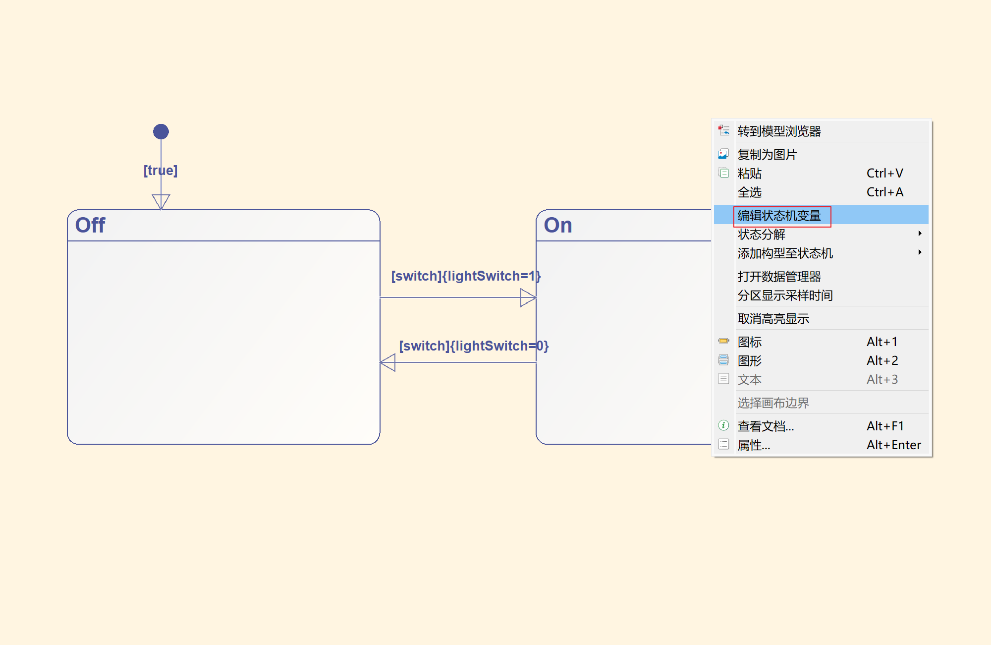 将 state 名称修改为 Off,state1 名称修改为 On。将鼠标放于 Off 状态模块边框上,待出现红色名称时候,单击边框长按拖出信号线连接到 On 状态模块。将信号线上 [true] 修改为 [switch]{lightSwitch=1}。