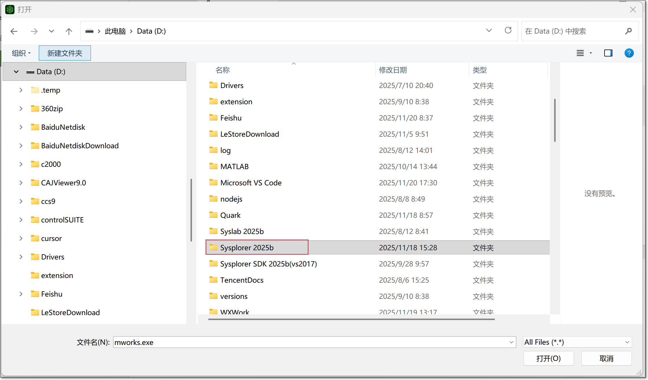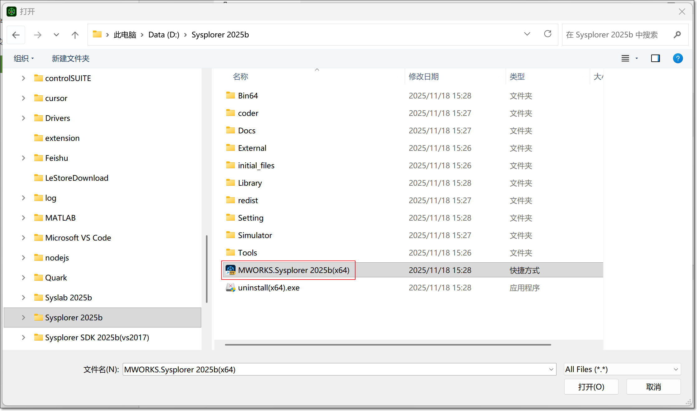 找到本地安装 Sysplorer 2025b 文件夹的位置,单击打开,找到 MWORKS.Sysplorer 2025b(x64)。由于安装位置和版本的不同,文件后缀可能不同。完成设置后重新从 Syslab 中打开 Sysplorer 即可。