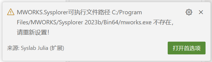 若出现 "MWORKS.Sysplorer 可执行文件路径不存在",则需要重新设置 Sysplorer 的文件路径,单击 Syslab 主页 > 首选项 > MWORKS.Sysplorer 可执行文件路径 > 浏览…。