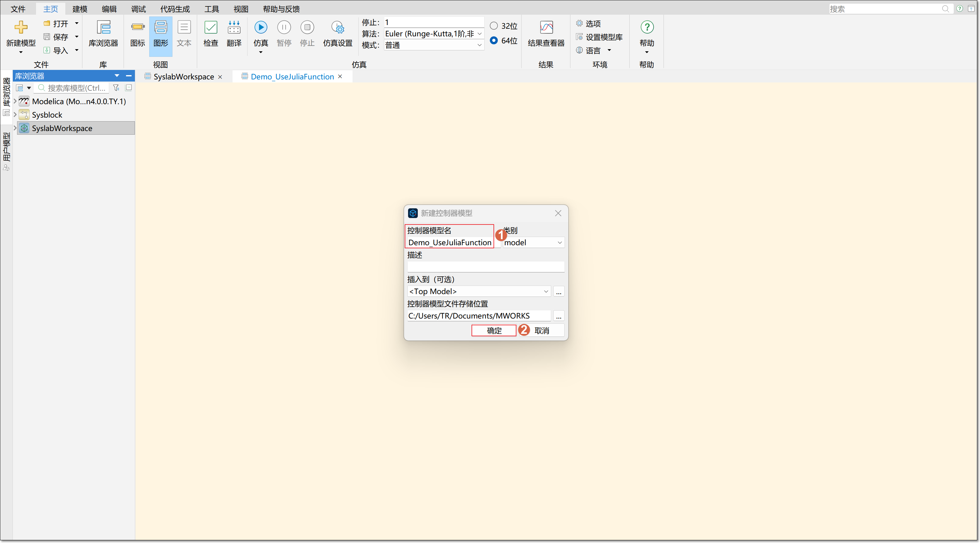 单击文件 > 新建 Sysblock 模型 > 创建新 Sysblock 模型,然后输入控制器模型名 Demo_UseJuliaFunction。