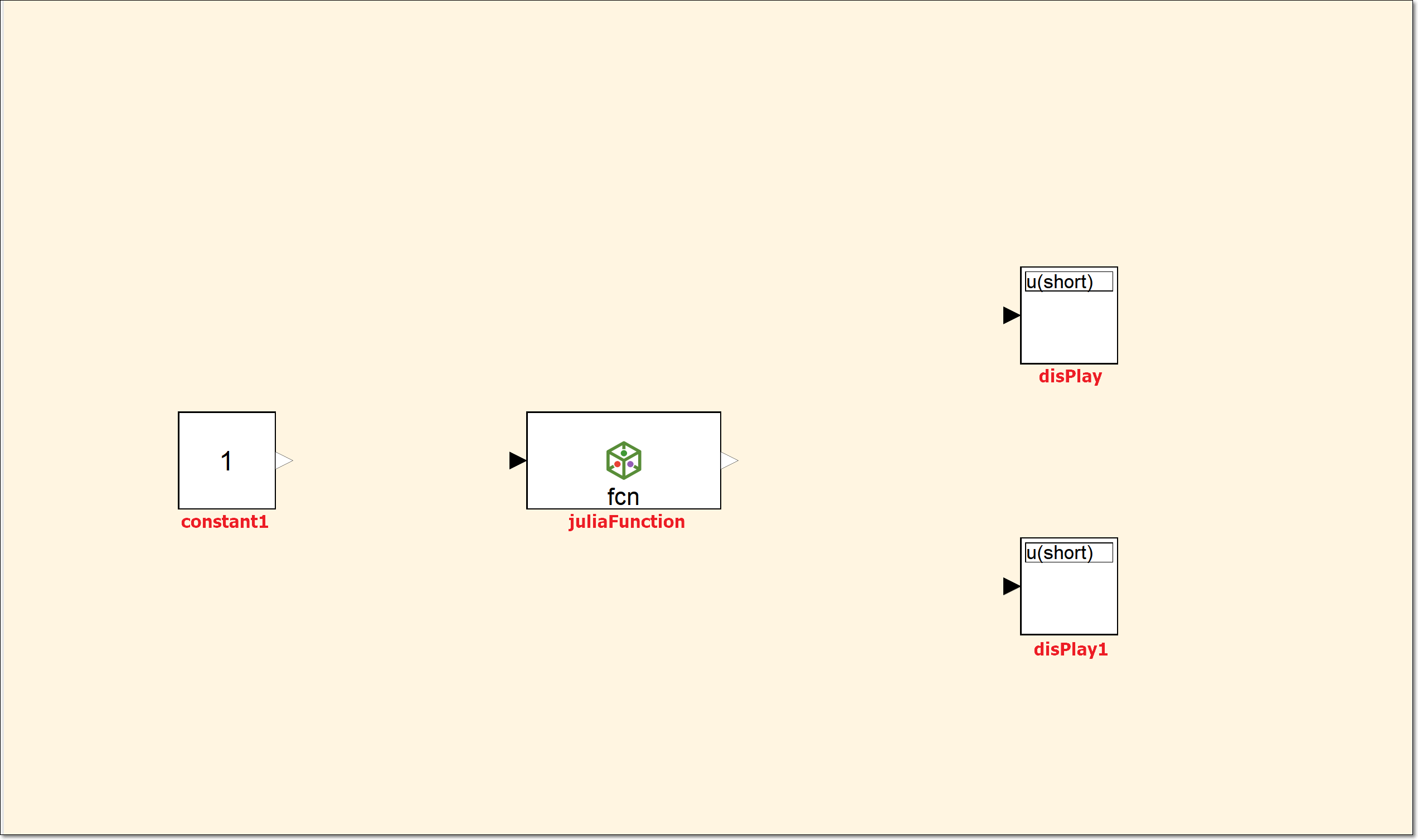 组件名 组件对应的模型库路径 Constant Sysblock.Sources(信号源模型库).Constant JuliaFunction Sysblock.Utilities (实用工具模型库).JuliaFunction DisPlay Sysblock.Utilities (实用工具模型库).DisPlay 在库浏览器中找到上述元器件,并且将它们拖到模型视图中,按照如下位置进行摆放。