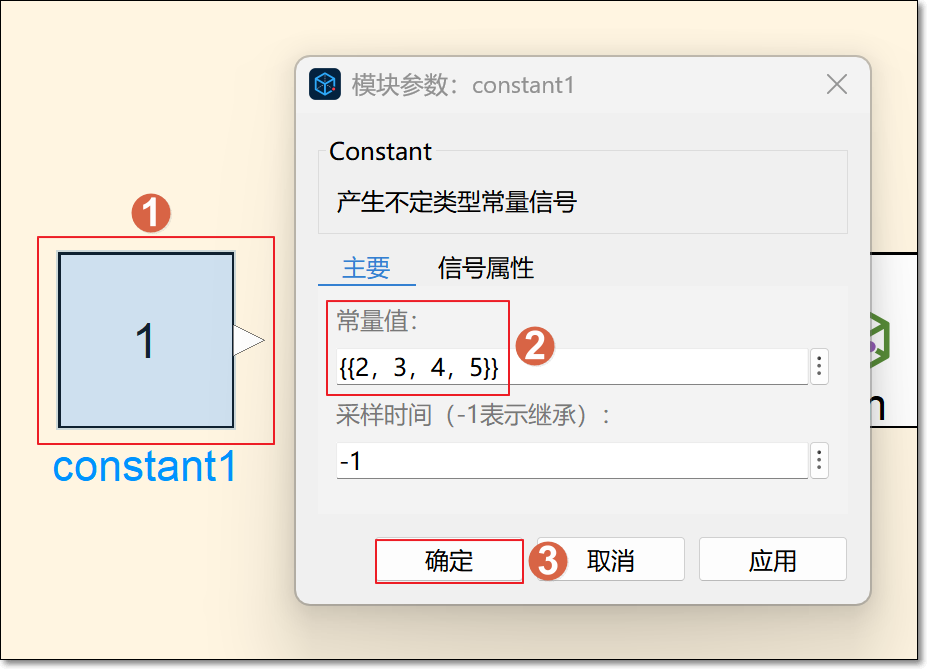双击打开 constant1 模块,将常量值设置为 2,此时为行矩阵。