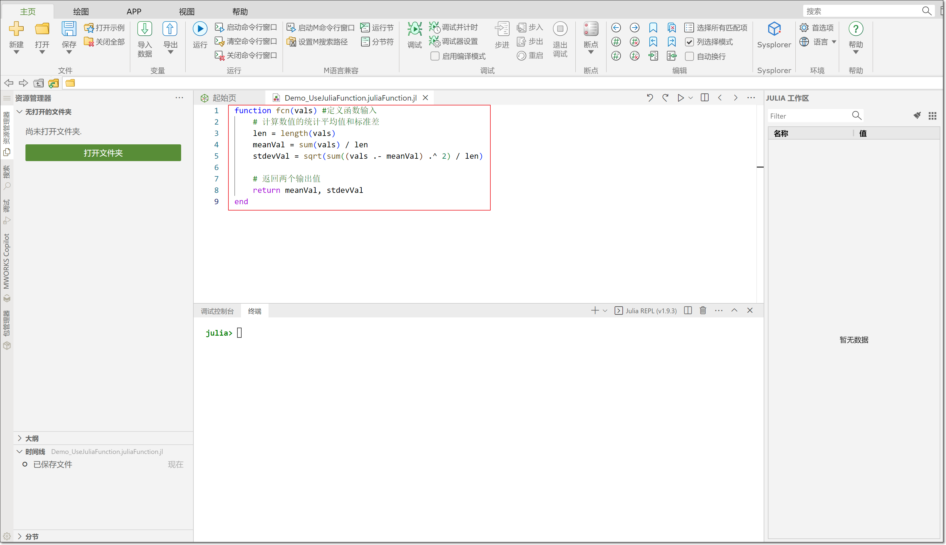 双击打开 juliaFunction 模块,为模块编程,以计算值行矩阵的均值和标准差,输入以下代码。