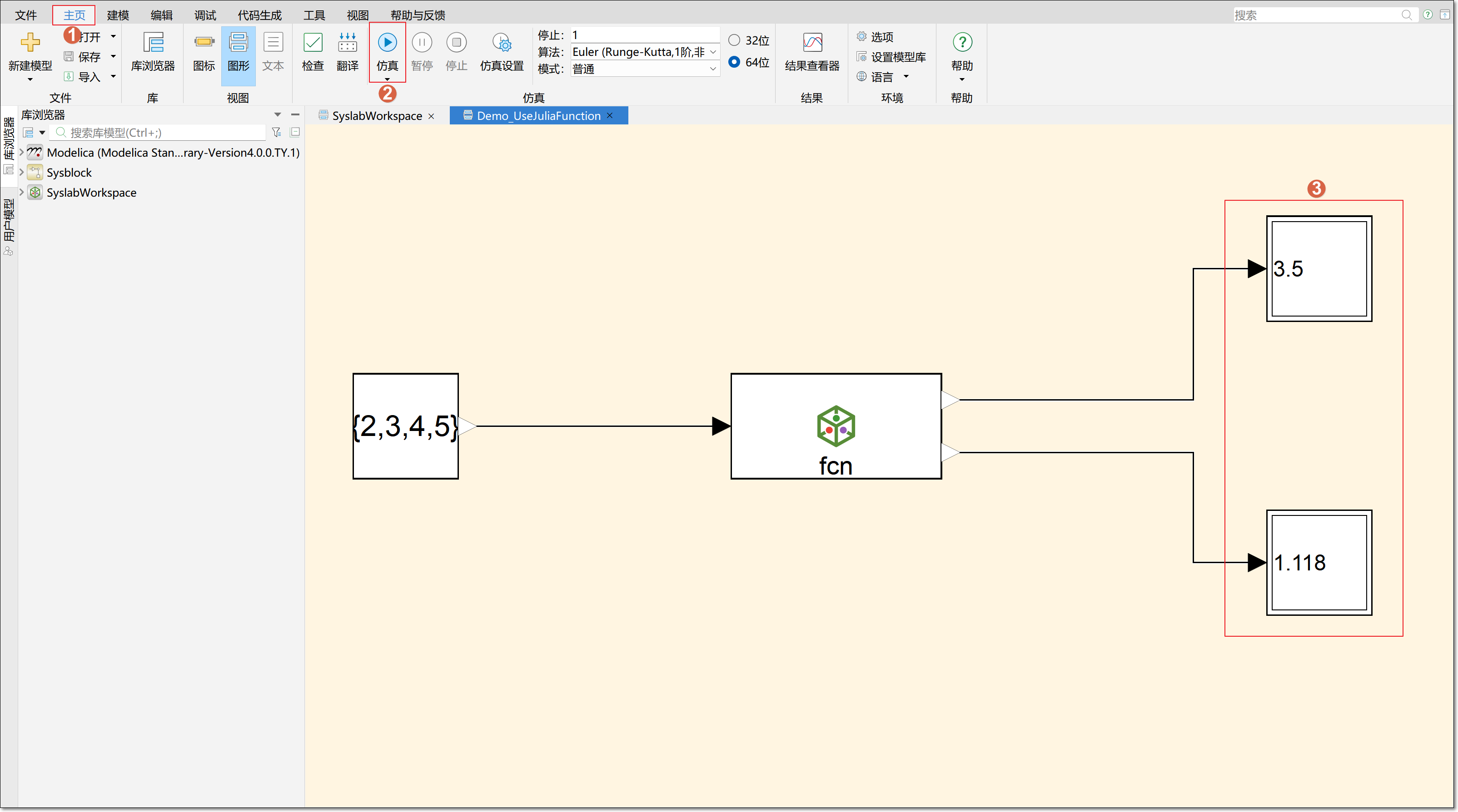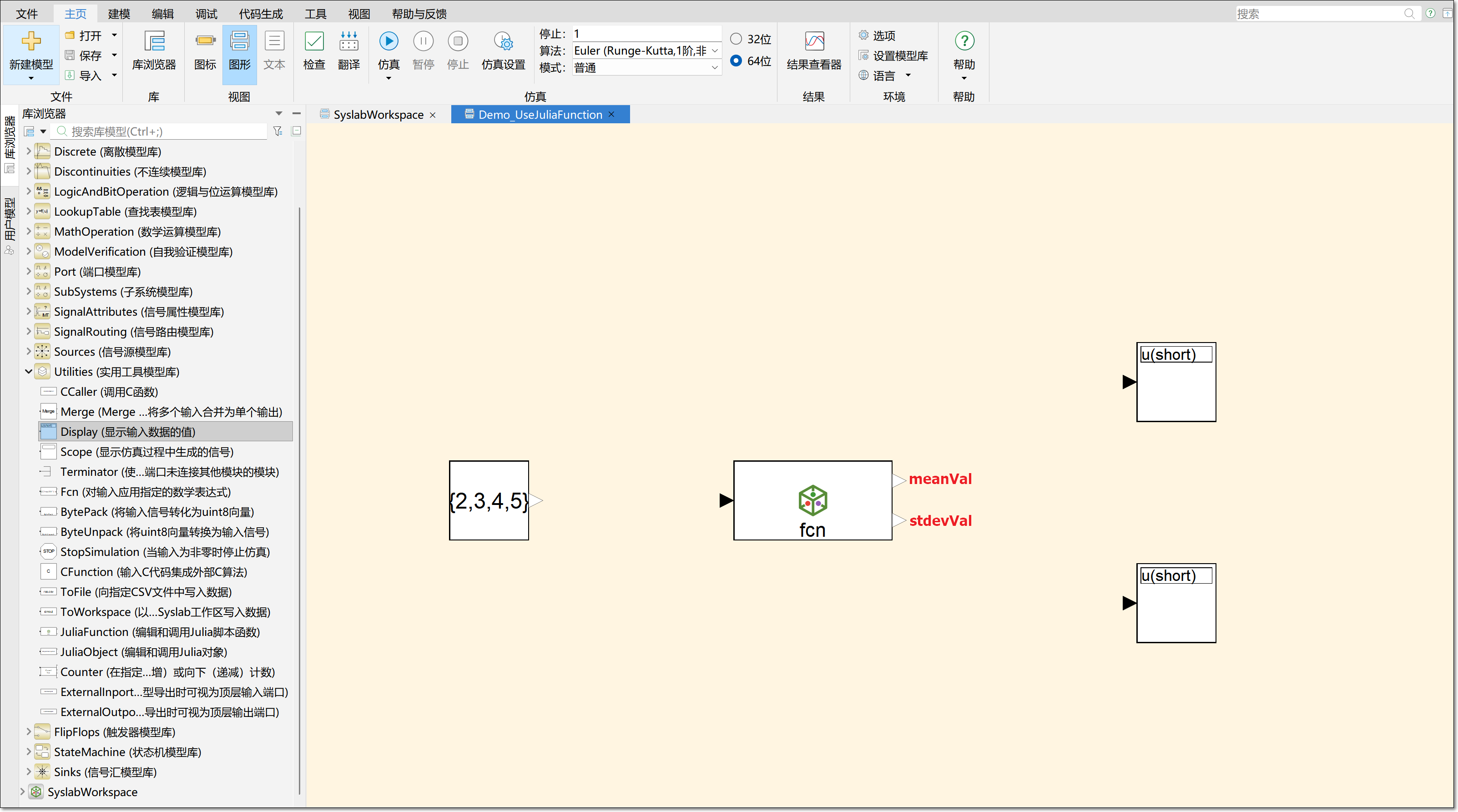 完成后回到 Sysplorer,juliaFunction 模块变为两个输出端口。第一个输出端口对应 meanVal,第二个输出端口对应 stdevVal。